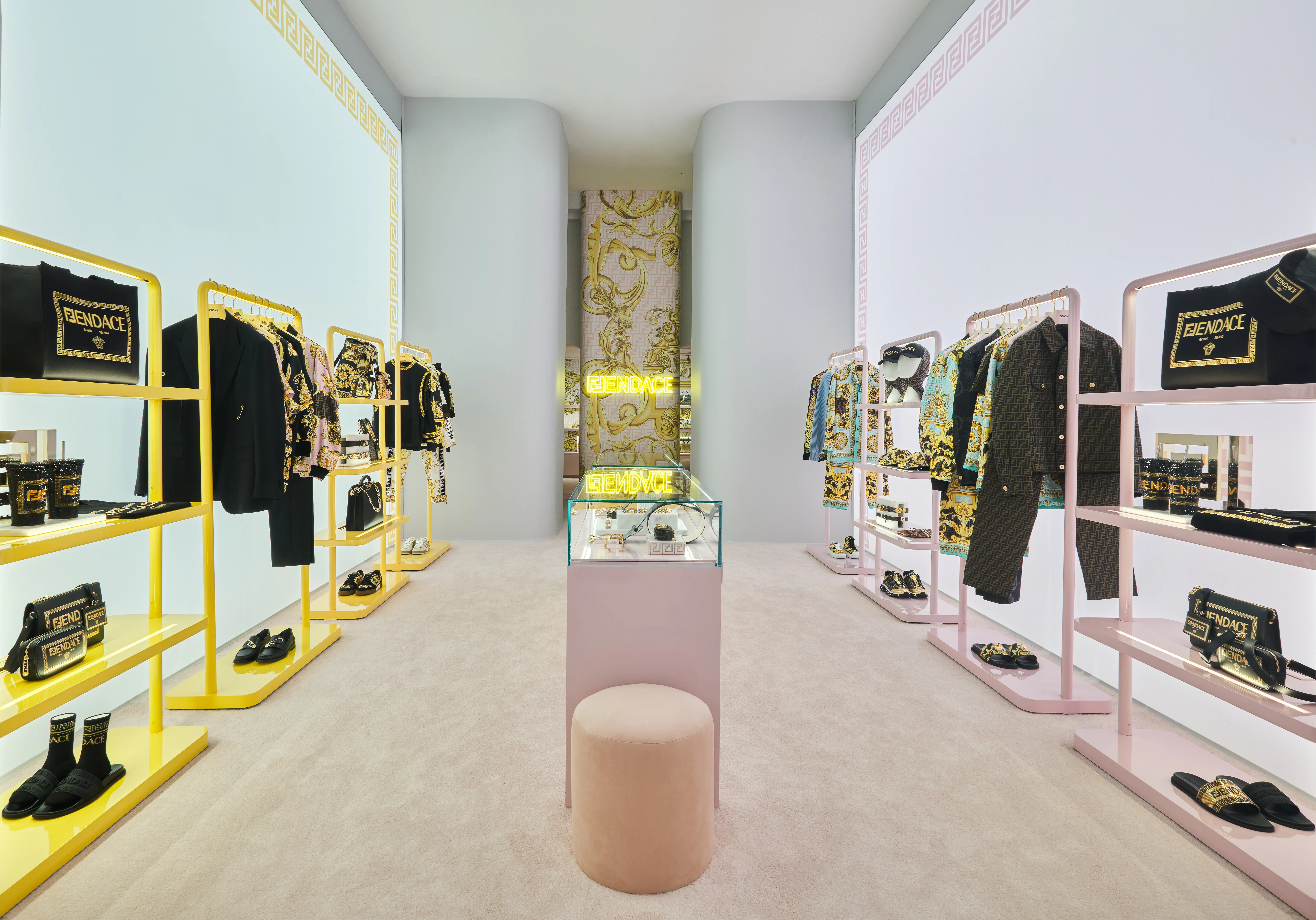 Think sculptural facades, custom furniture and fixtures, and fitting rooms that became immersive moments rather than functional endpoints; elements that echo the duality at the heart of Fendace.